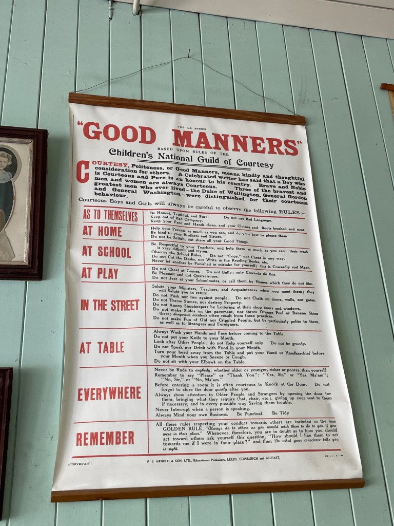 The girls loved seeing some of the old ways things were done, such as how newspapers used to be printed and how old school classrooms used to be. I suggested we adopt the Good Manners rules in our van…