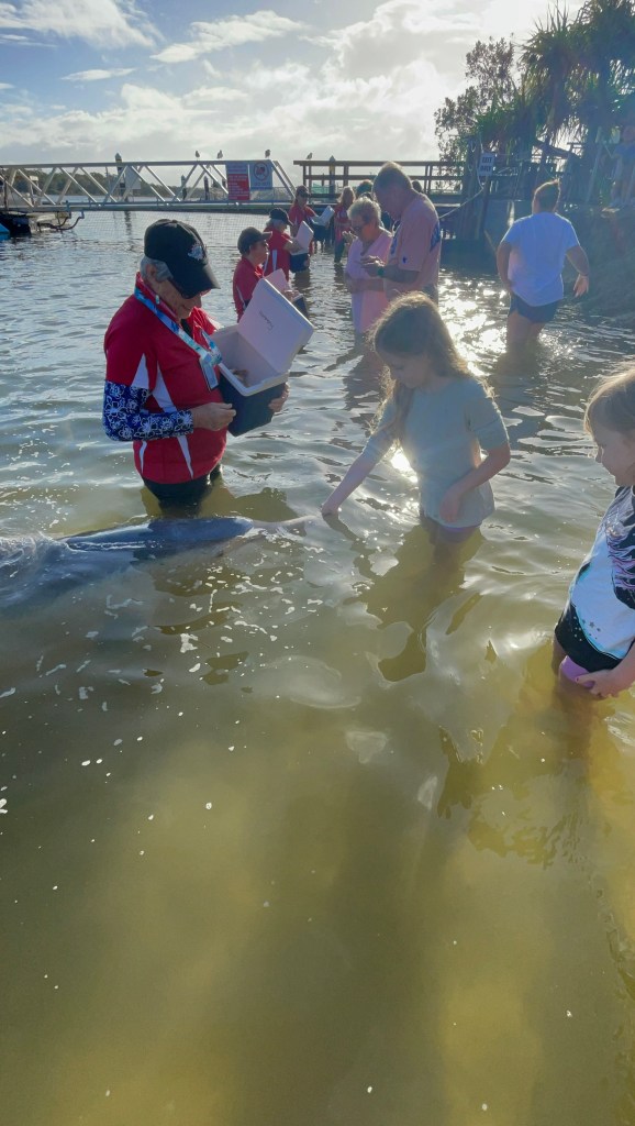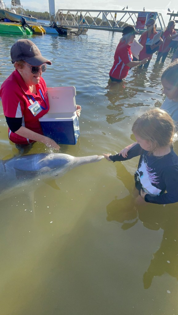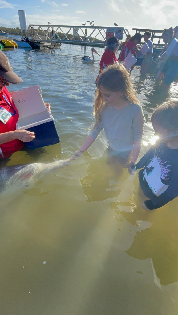 Then it was time to get in the water to feed the dolphins! As this is strictly overseen and guided by the department of the environment, each adult dolphin has a quota of 3kg of fish (a small proportion of their diet) and that’s why they have to strictly monitor the number of visitors and how many fish each visitor is allowed to feed the dolphins. First we got to feed Harmony and the girls were excited but a bit apprehensive with the first fish. By the second they were loving it, but it was time to get out. Jazzy and Izzy managed to charm their way into getting into the water again and this time we got to feed Ella, a 43 year old mother and grandmother of the pod. The girls were pros at feeding the dolphins by this stage! It’s so tempting to just pat them, but that is strictly prohibited so we kept the urges at bay…
