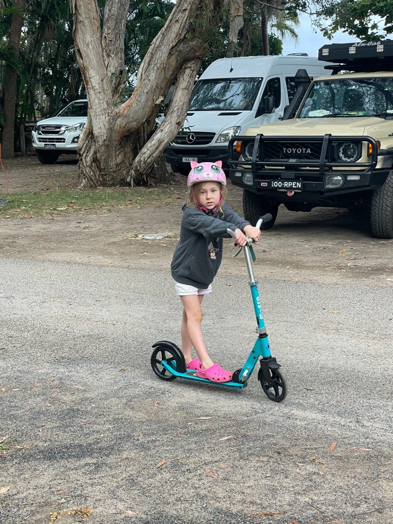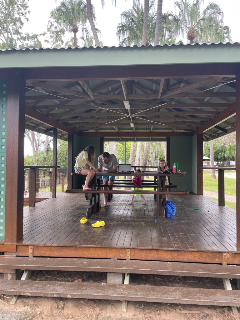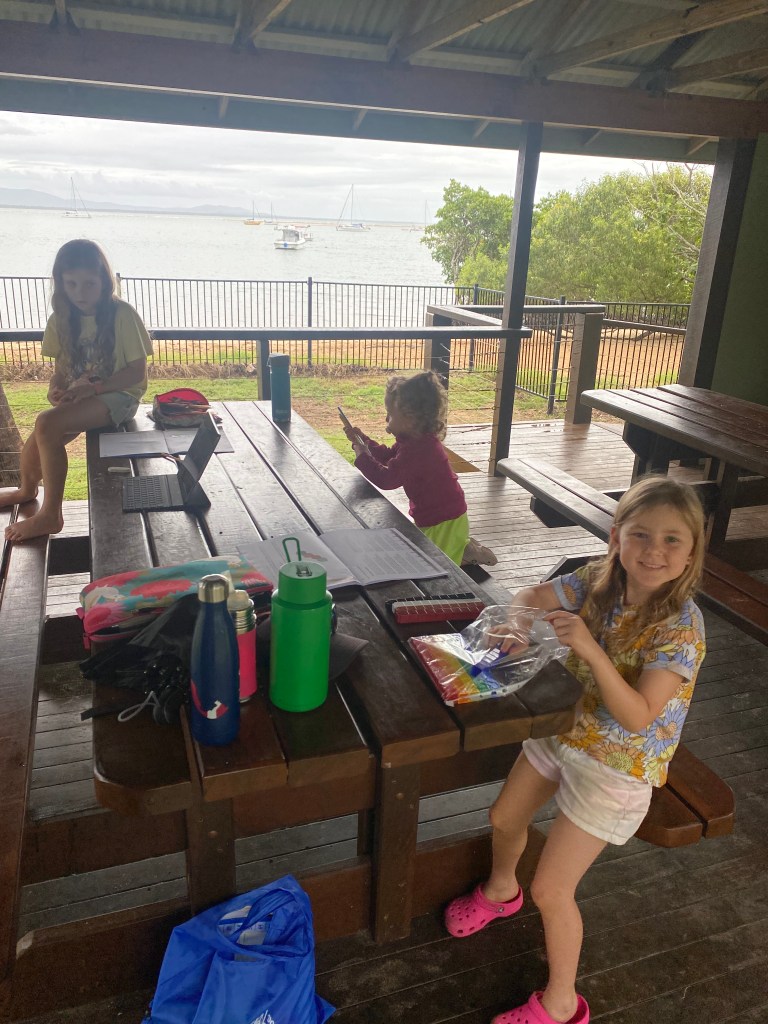 The morning consisted of scootering around the caravan park with her friends for Jazzy, followed by work for me and homework club for Chris and the kids. At least we had room to spread out despite the rain and each had our own pergola.