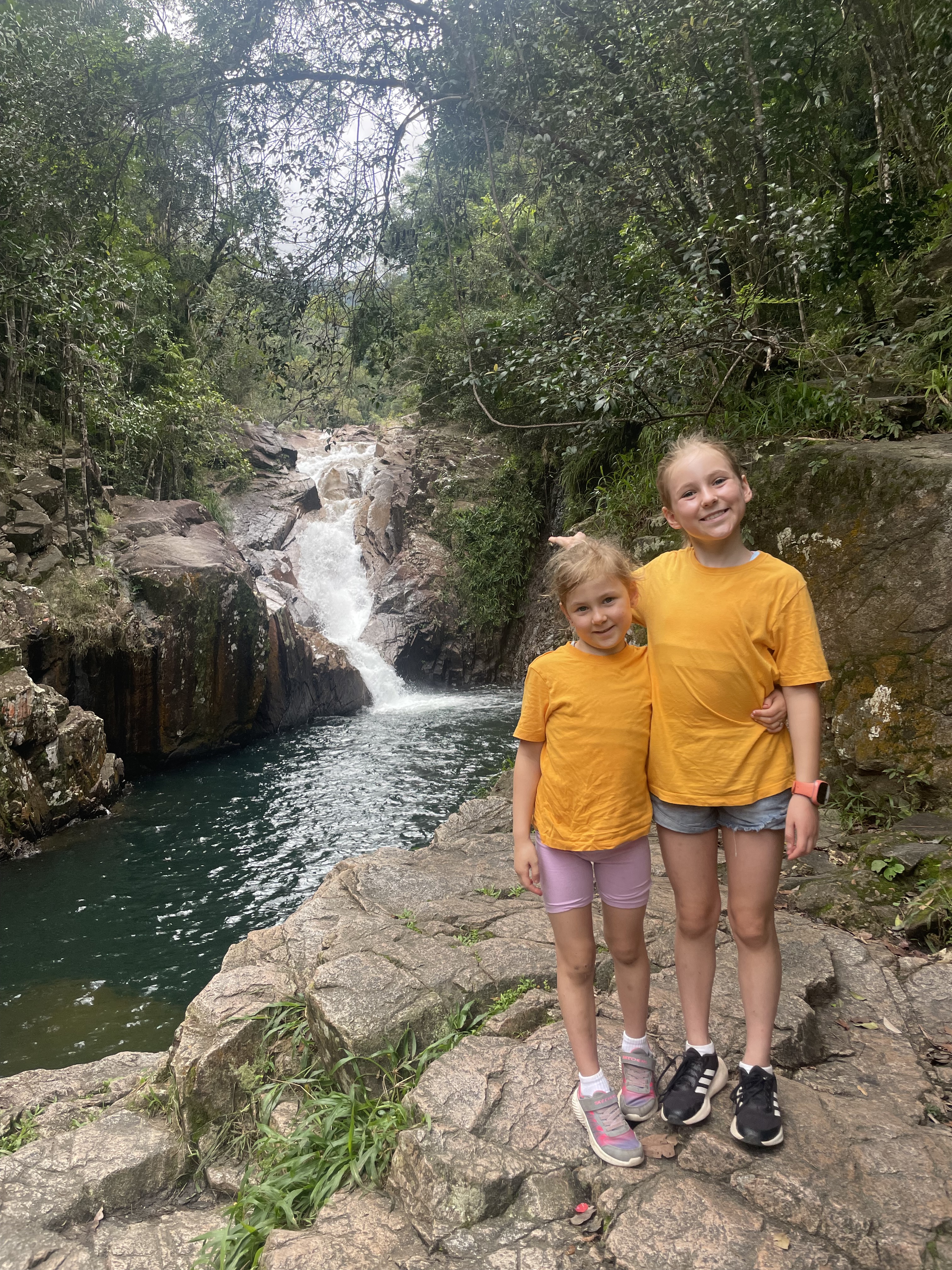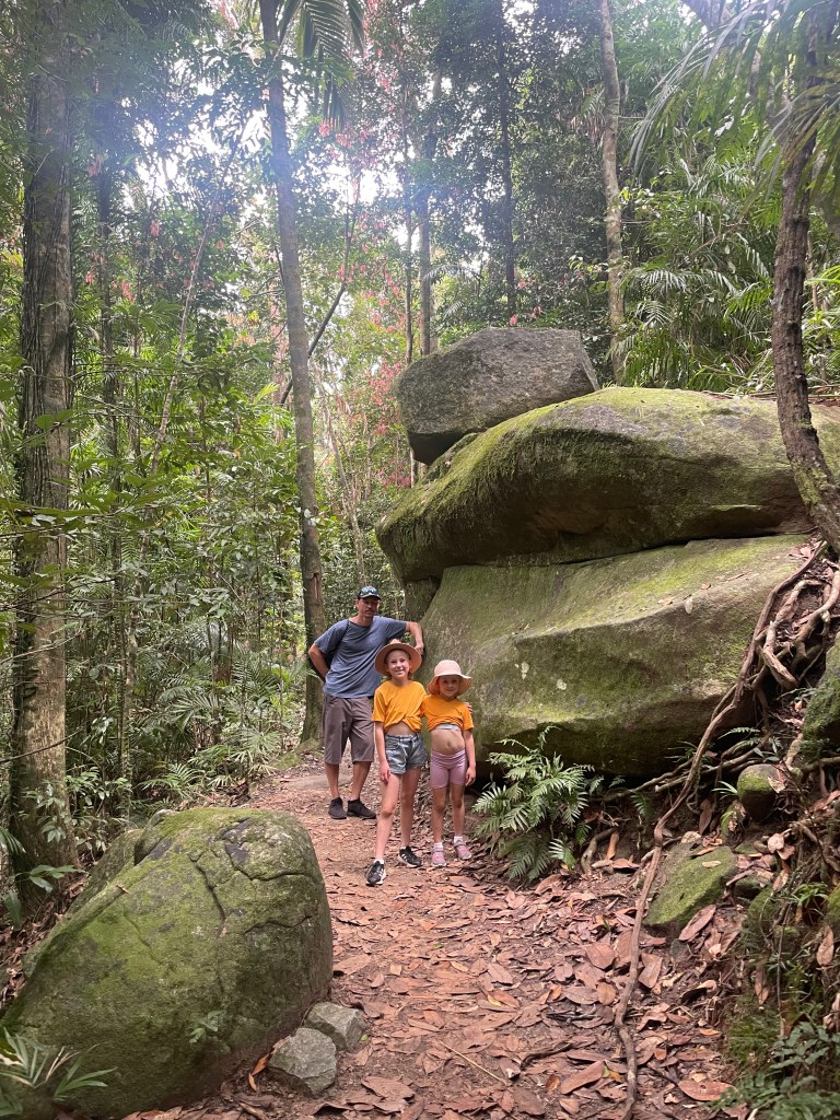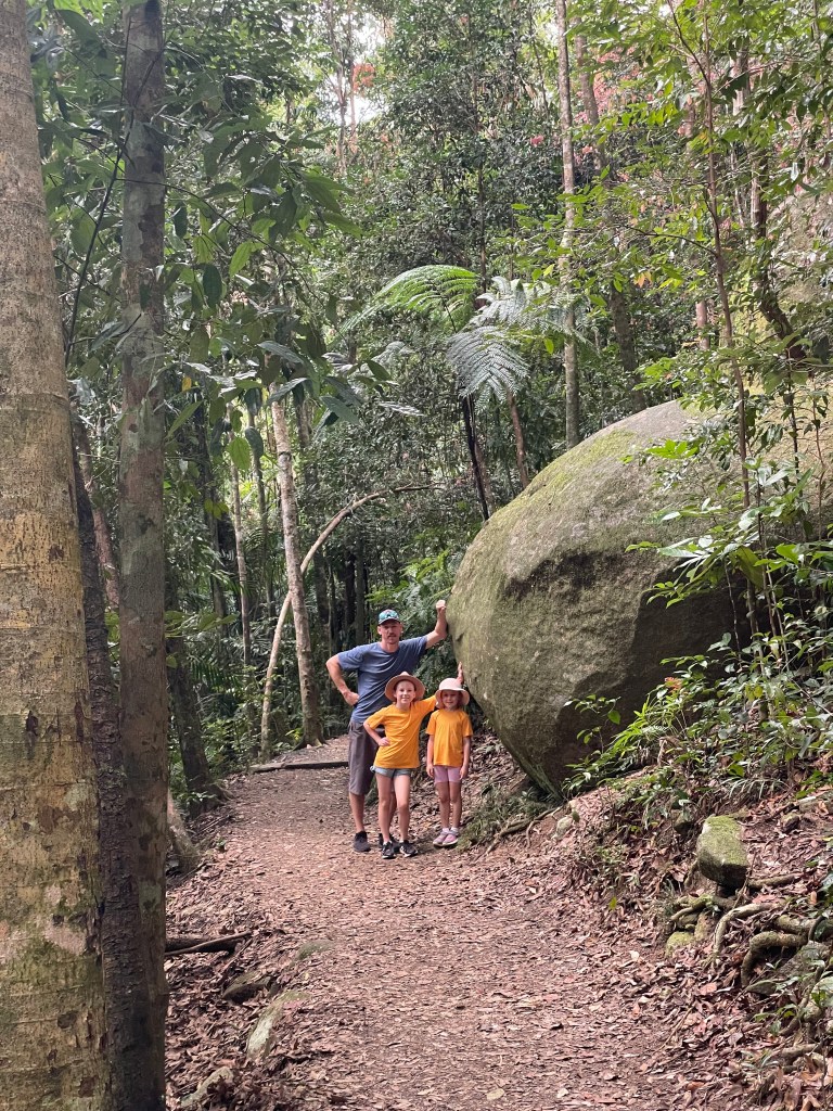 The creek looked beautiful but chilly this morning. The girls kept asking if they could go for a swim in the morning, and whilst I know that no water temperature phases them, it was just too cold. Instead we packed up the van and headed into Finch Hatton Gorge. Luckily the track to the waterfalls we wanted to visit was still open, as there has been a lot of rain and landslides in the area recently. Our three adventurous leaders set off through the beautiful rainforest. I love seeing all the different vegetation, rocks/boulders and listening to the various wildlife you can hear as you walk. The only thing I never want to see is snakes & spiders.