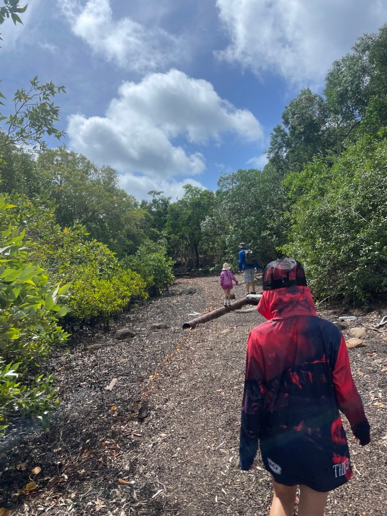 We were lucky it was later (although also hotter) in the day and there weren’t many cars around. We got a parking spot in the shade – winning! And headed out around the mangroves as it was still too high tide to walk along the beach. The sun was HOT 🥵