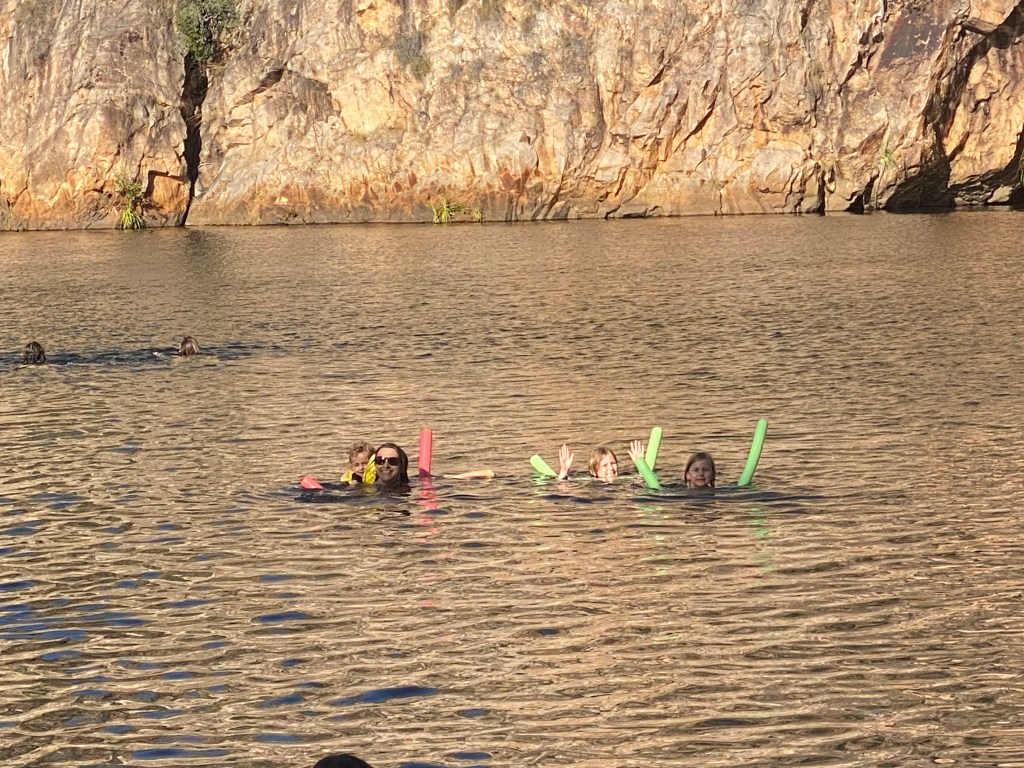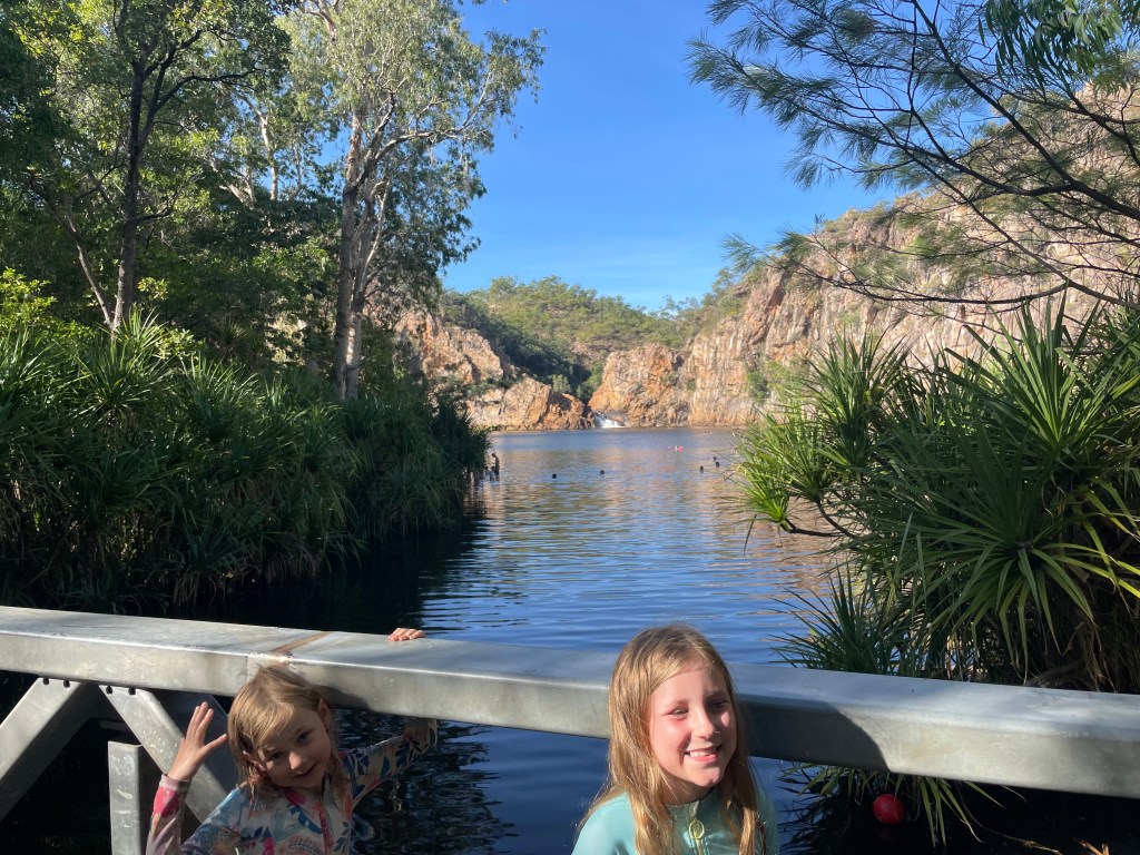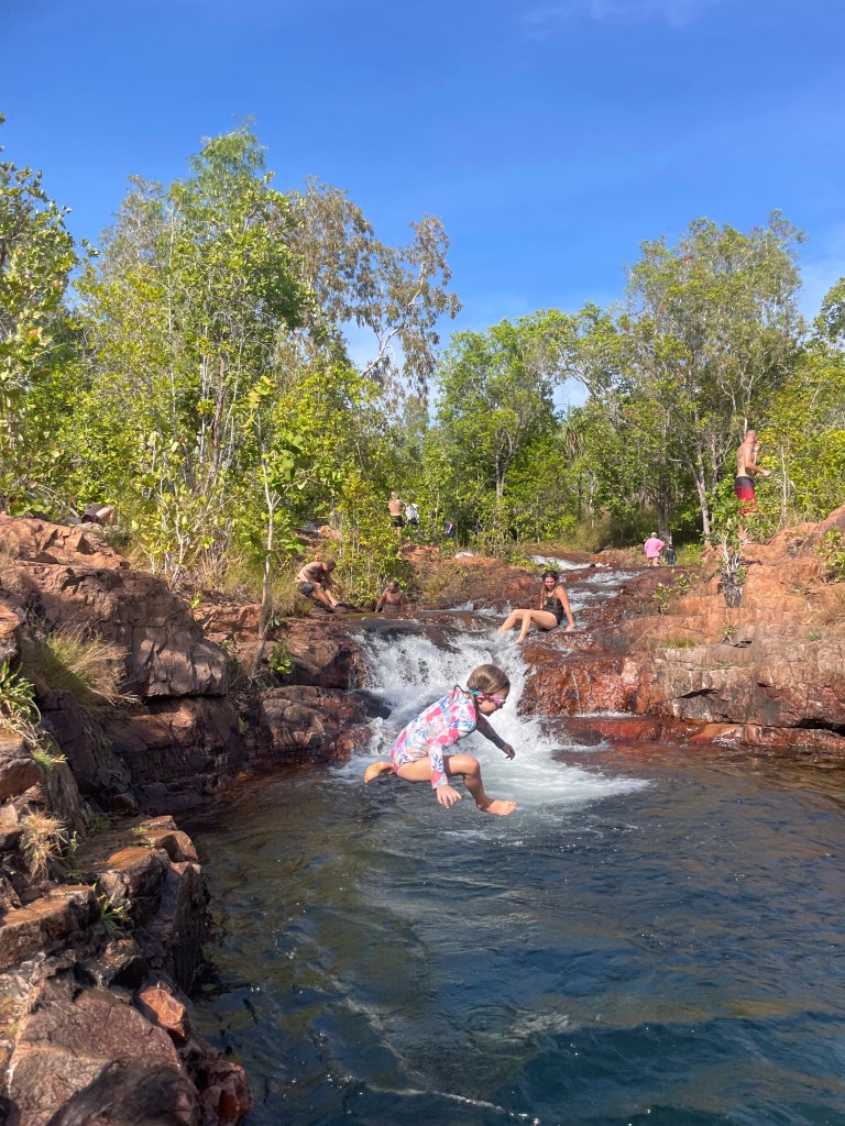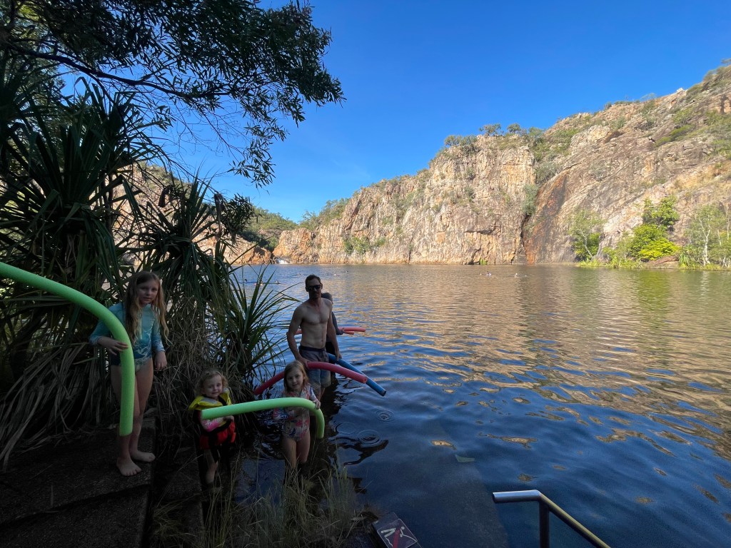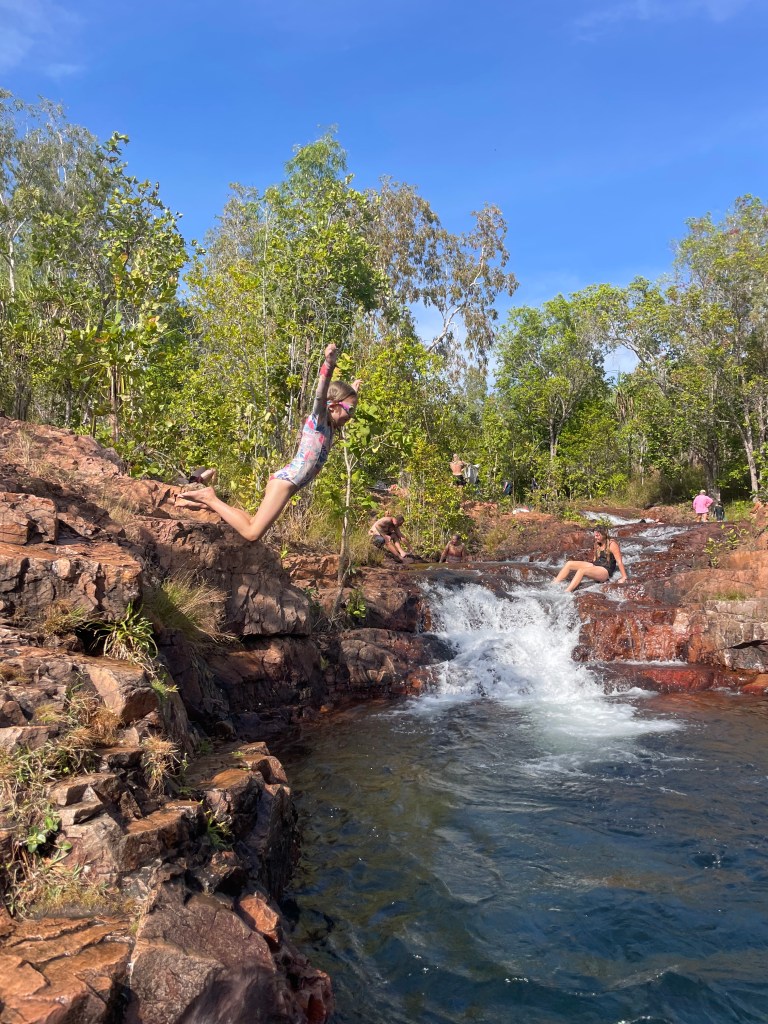 It was a busy day of driving and sightseeing, but we made it to Edith Falls with enough time for a swim. The water was freezing when you first jumped in, but swimming out a bit further to where the sun hit the water was nice and even the girls got more comfortable with the idea.