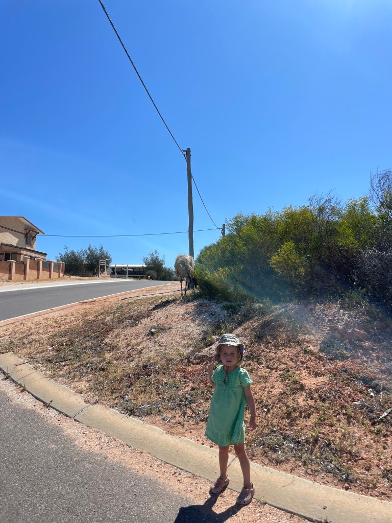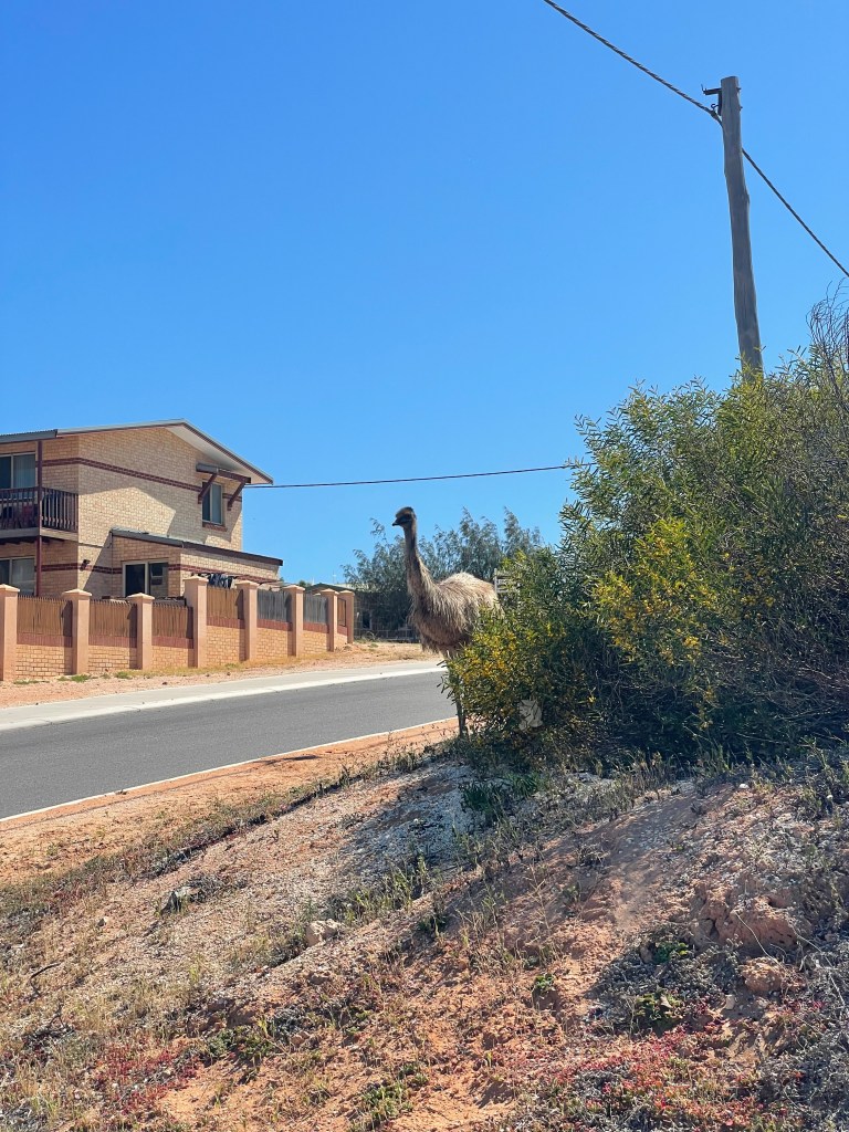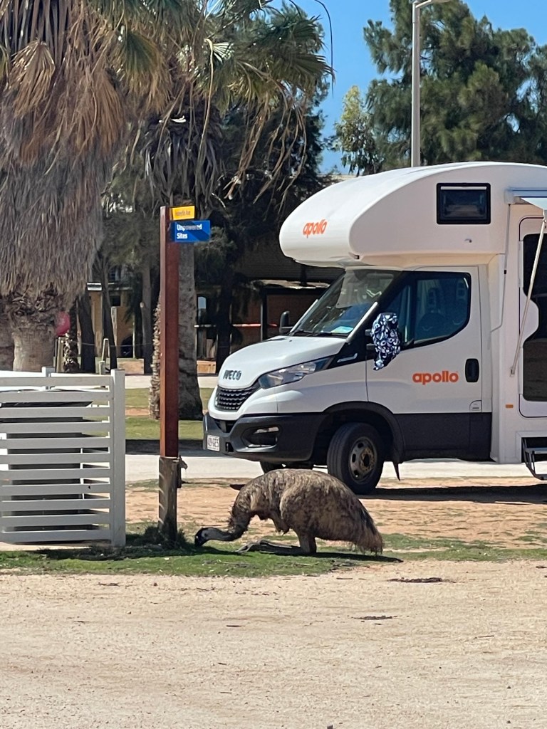 Jazzy also spotted a number of emus roaming the streets, it’s so bizarre seeing them in the town. As we started driving towards Monkey Mia we had a mama emu cross the road with her babies, so cute. Then Monkey Mia had them roaming all over the campsite, drinking water from the taps and roaming to see if they could scavenge any food. So the novelty was starting to wear off!