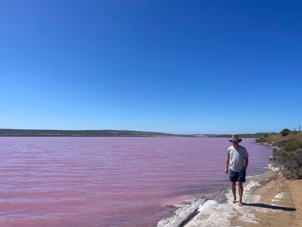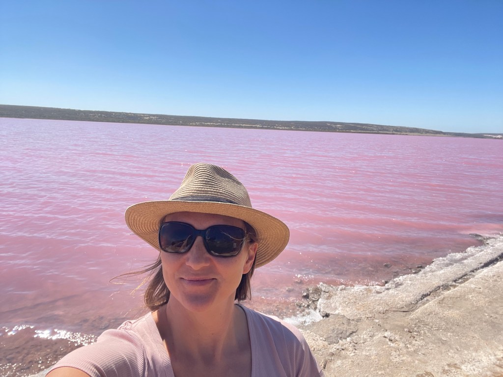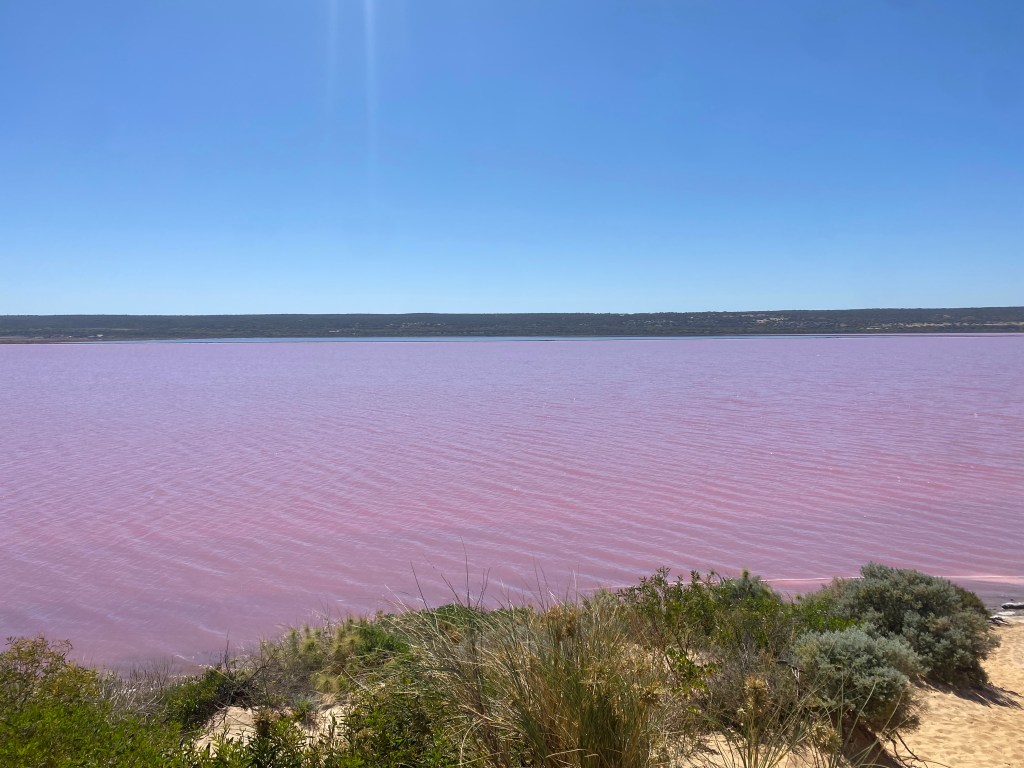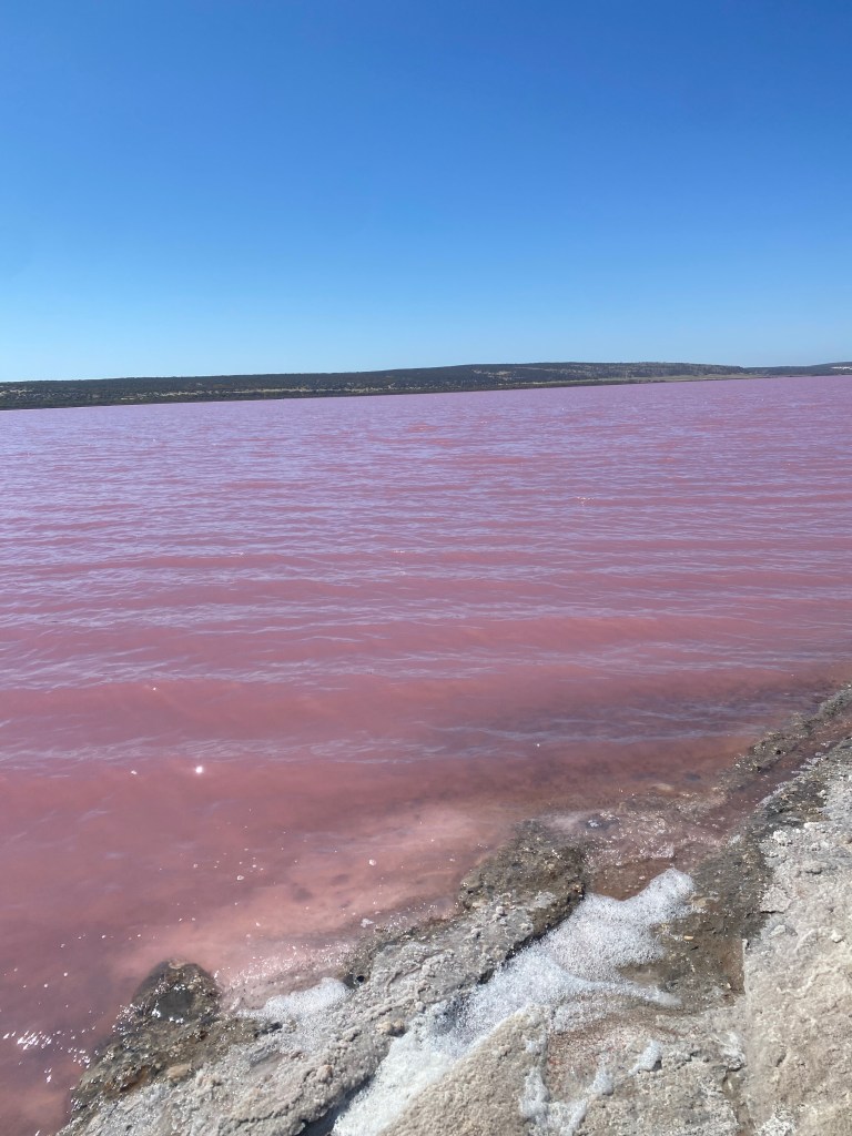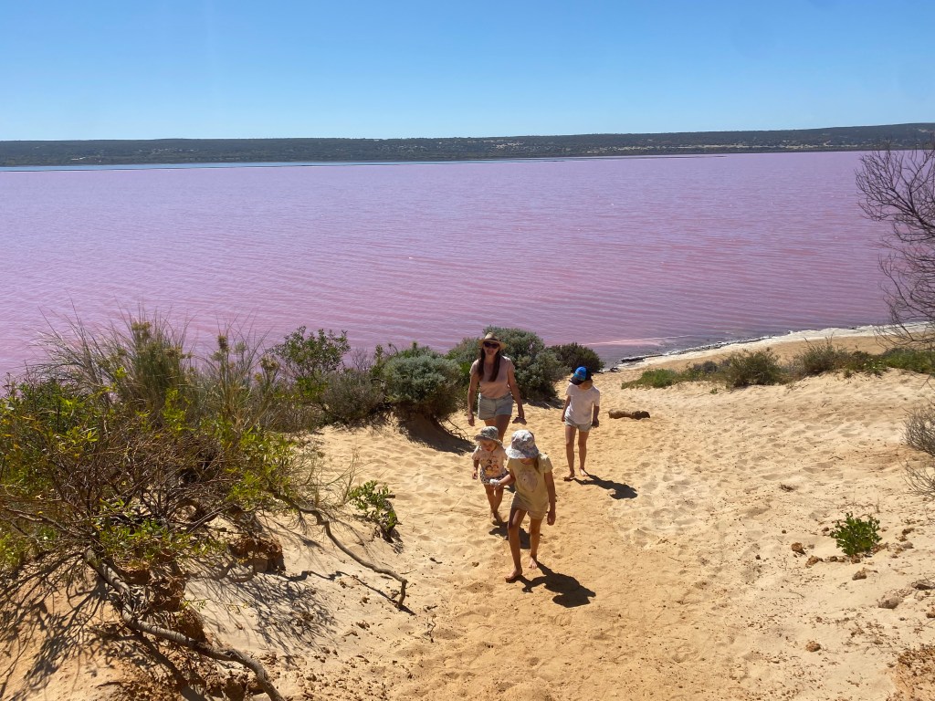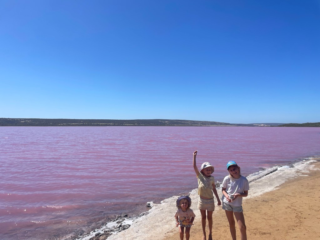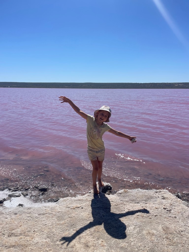 We had a lengthy drive ahead of us, so the lunchbox was ready to keep the masses fed and we tried to stop again to stretch the legs. The next stop certainly got everyone out of their funk when they saw Pink Lake! For the curious, it gets its colour from algae or bacteria and the right conditions such as high salinity and sunlight, which will determine the intensity of the pink. It is very magical place and was a hit with everyone. The girls also collected some salt crystals from the shoreline as a souvenir.