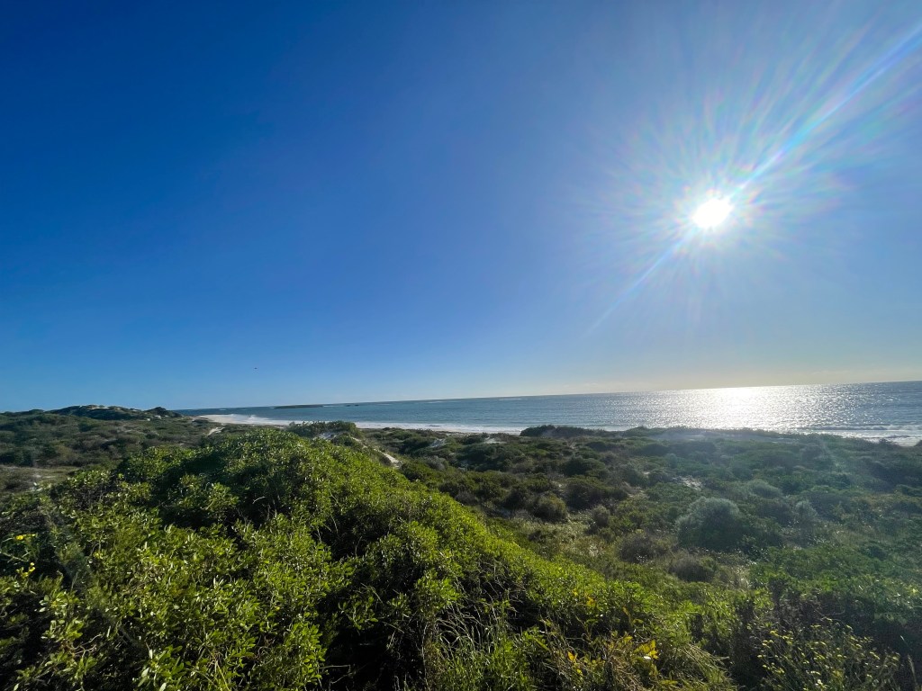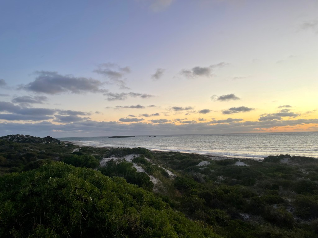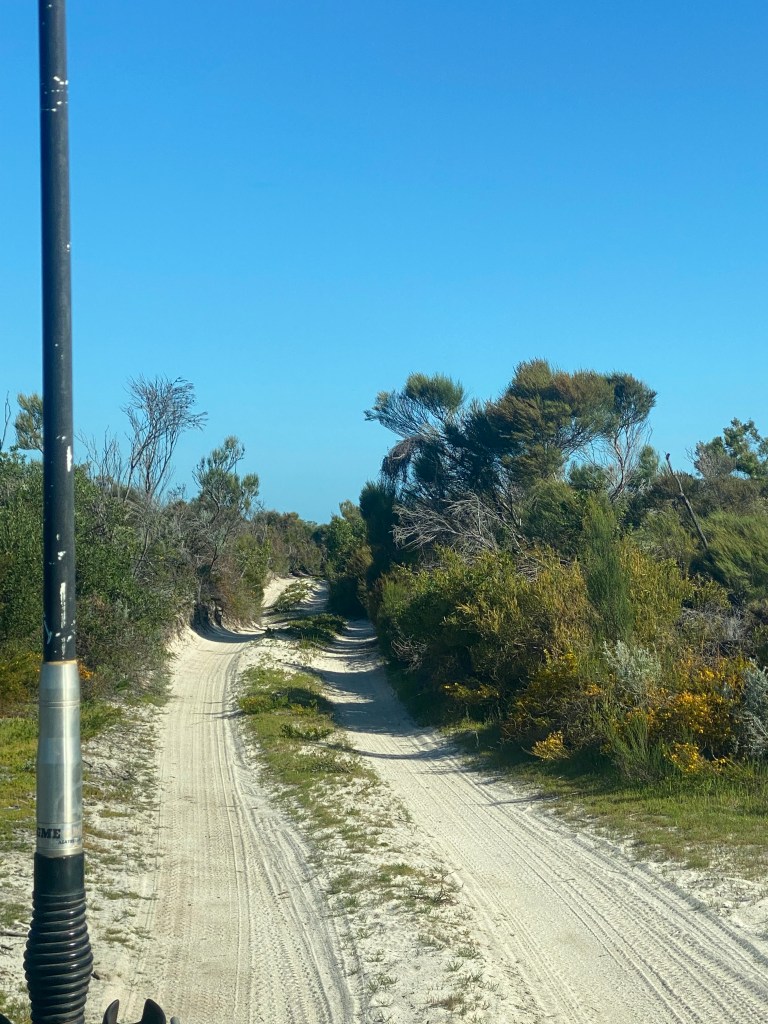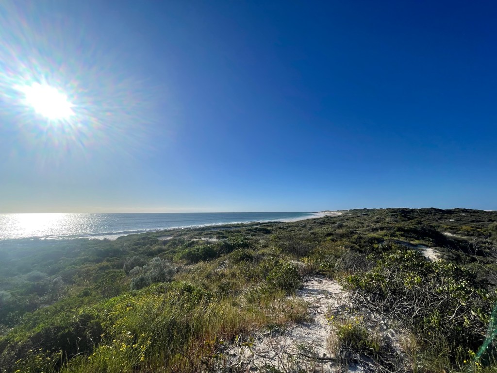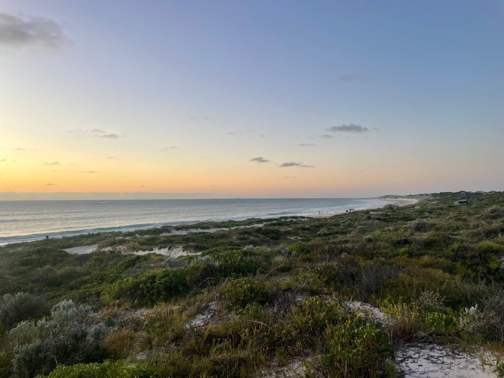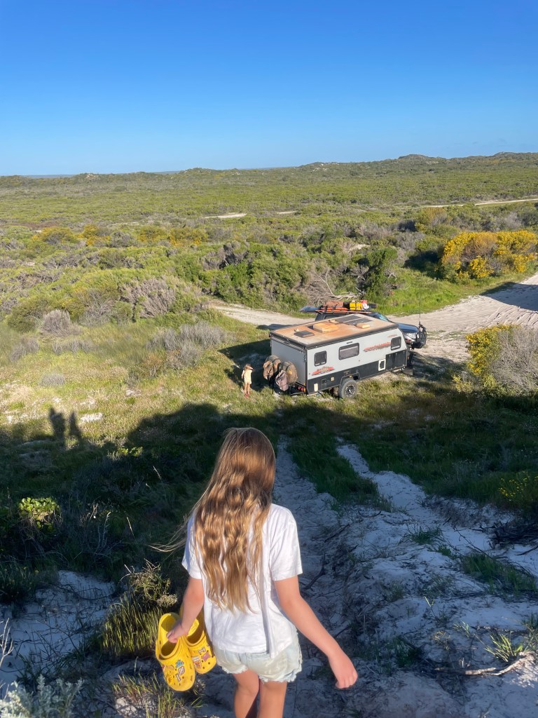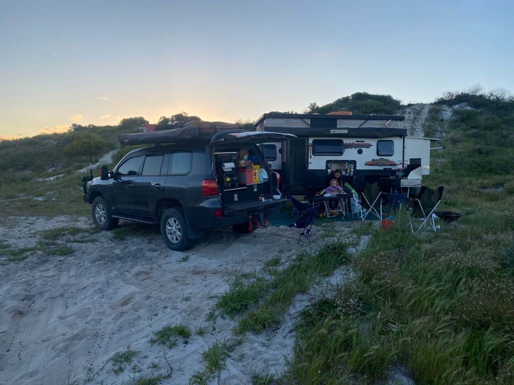 Then we headed to our final destination for the afternoon – Sandy Cape South, which is a 4 x 4 park near Jurien Bay. The track in was so narrow we had to pull all the mirrors in and you could hear everything being scratched (and Chris cringing with every scratch!). As the spots were unallocated and it was the start of a long weekend in WA there were a lot of people around, but we managed to snag a great spot one dune back from the beach. If you climbed the high spot of the dune, you got a magnificent view of the beach!