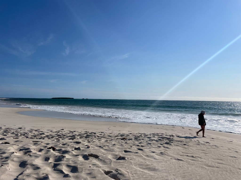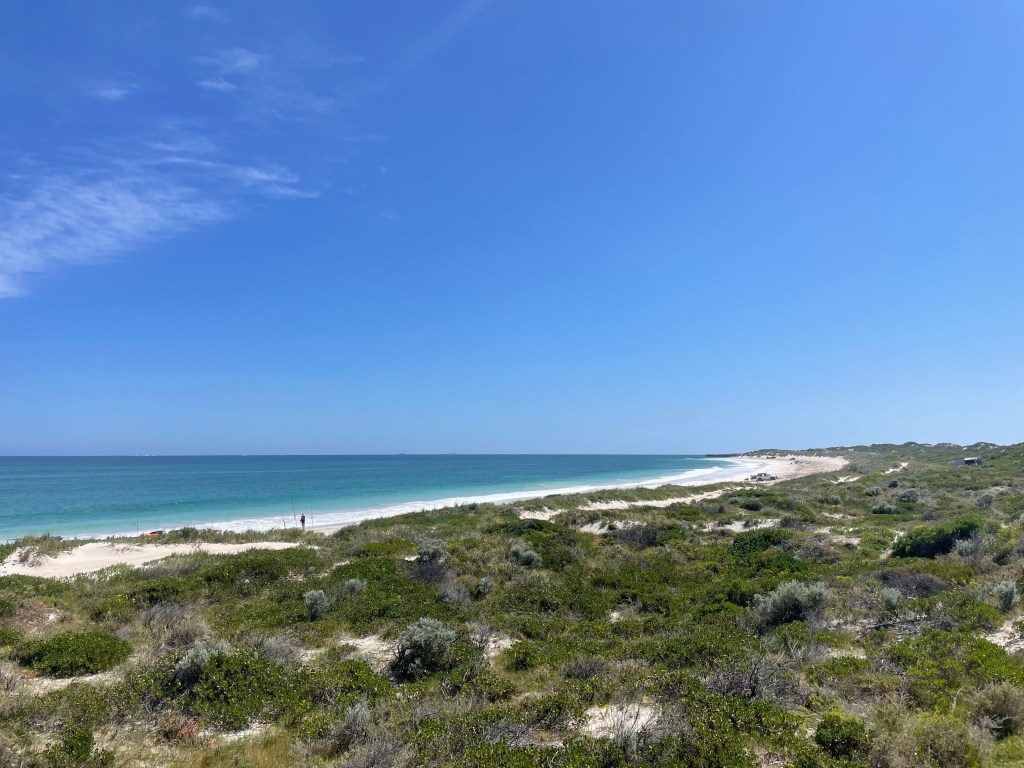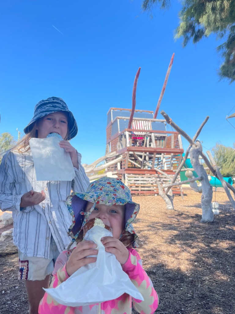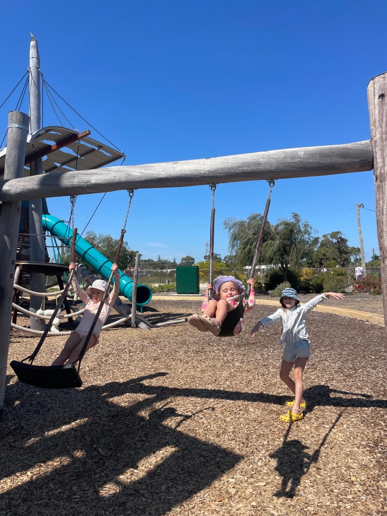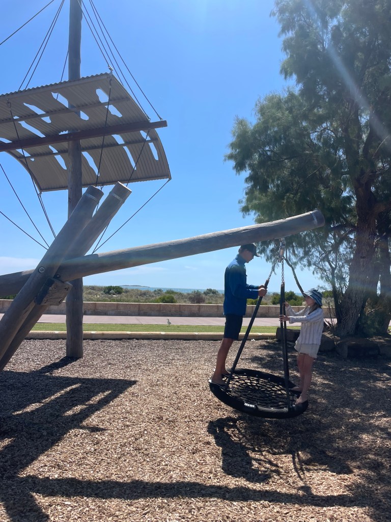 We went on a drive to see if there were some calmer inlets or beaches to swim, but it all seemed a bit rough or too cold. So we briefly popped into Jurien Bay and got tempted by the bakery with its sausage rolls and many a treat… and a brilliant playground.