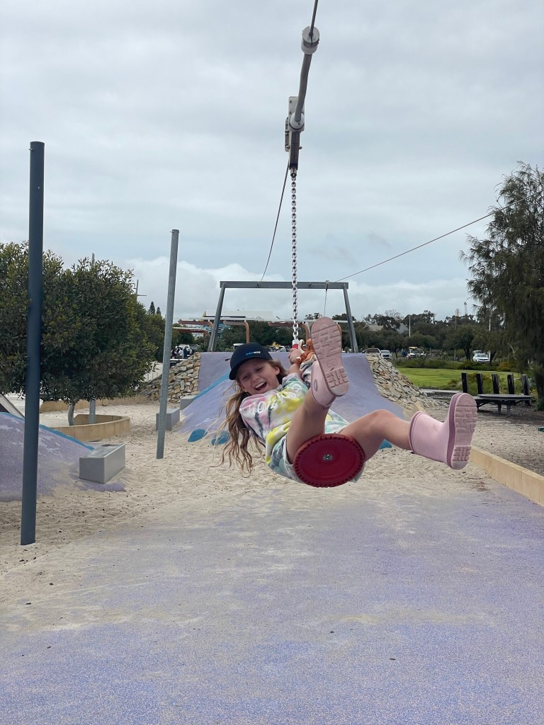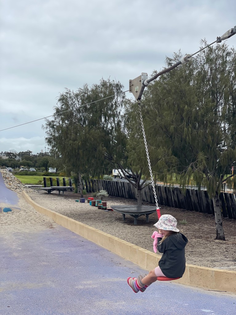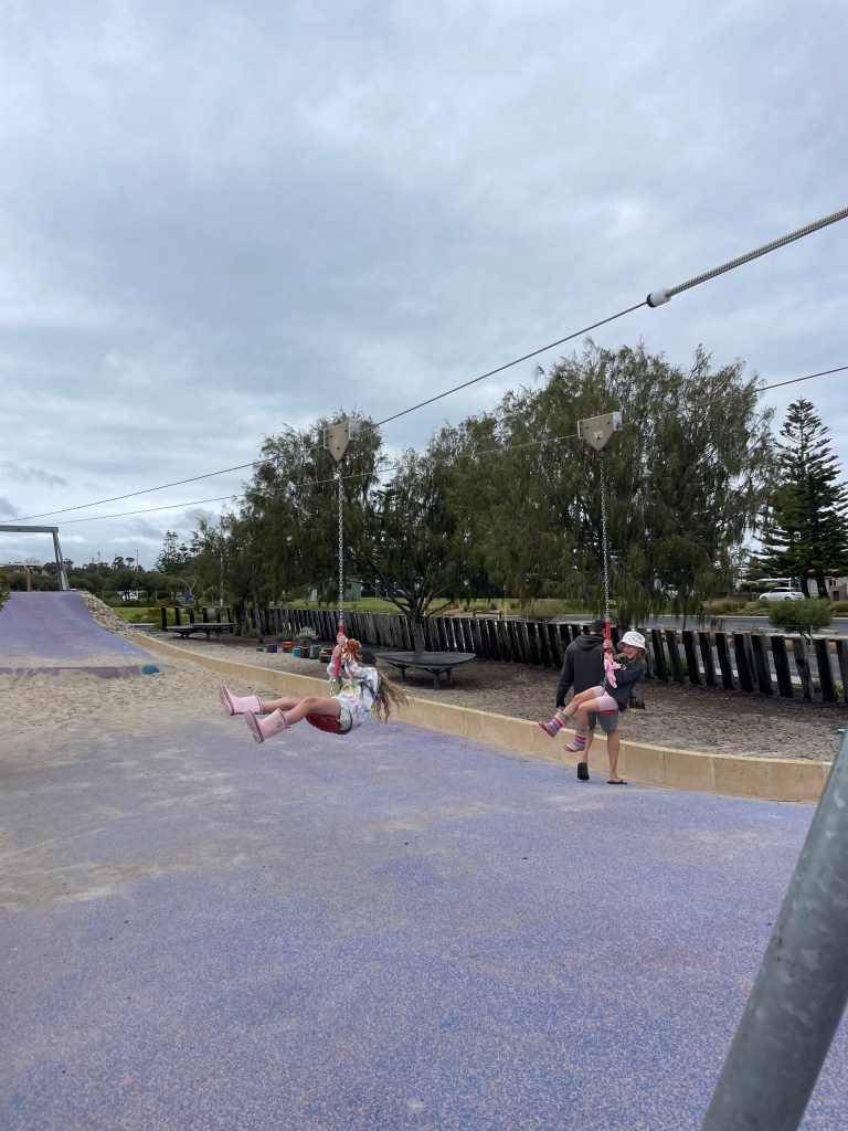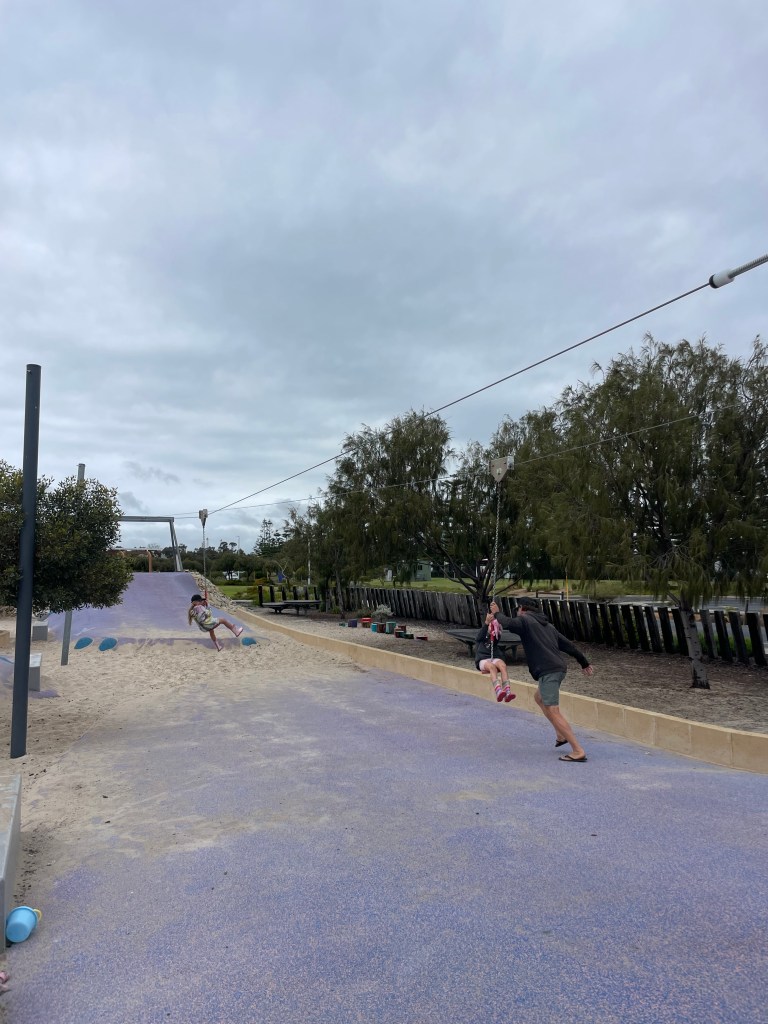 So we headed for a walk and of course, stumbled across a playground. The big girls had a great time racing each other on the giant flying fox with a helping hand from mama while Scarly explored the water play and other parts of the park.