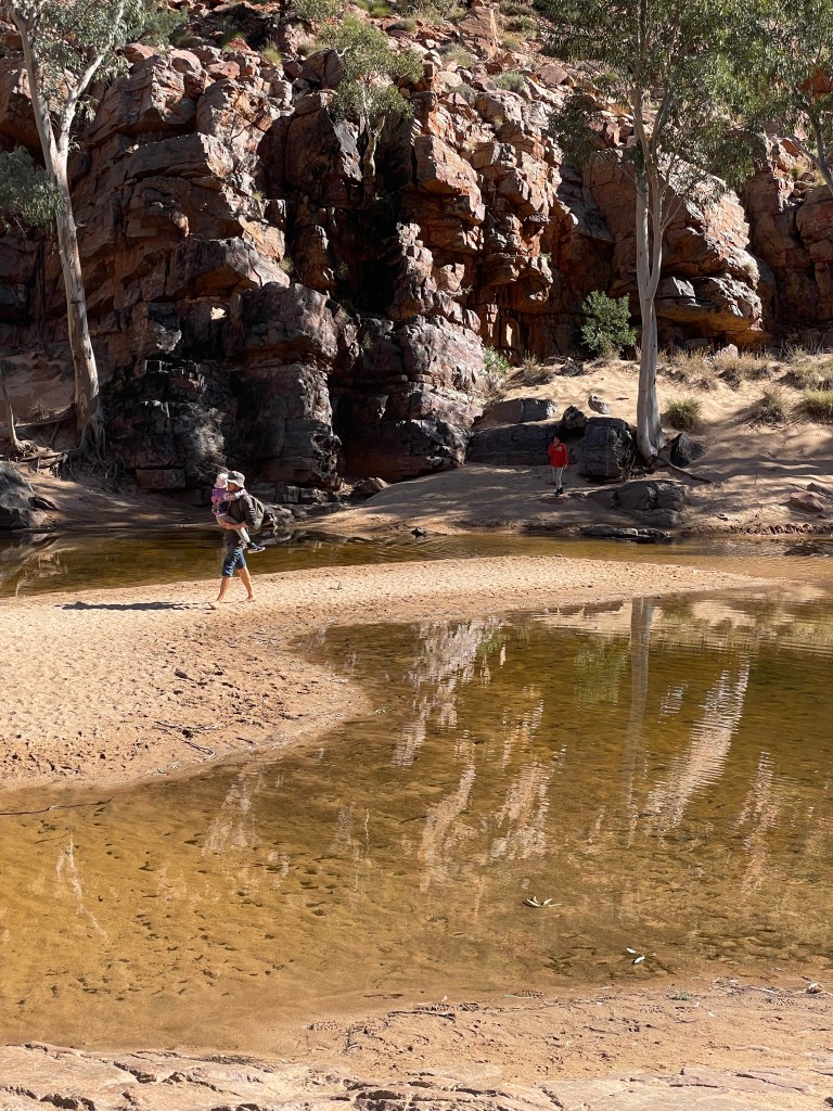 We continued on around the cliff edges and eventually made our way down to cross over to the other side. Unfortunately this year (or this time of year) there are a lot of dead fish in the water so it wasn’t water anyone really wanted to cross barefoot… but unfortunately for Chris and I that’s what we had to do and carry the kids across. We picked a spot where we couldn’t see any dead fish, at least! Apparently it’s caused by low oxygen levels, likely to be due to the cold conditions at the moment. Such a shame, because we enjoyed a swim at Ormiston every day during our 5 day hike!