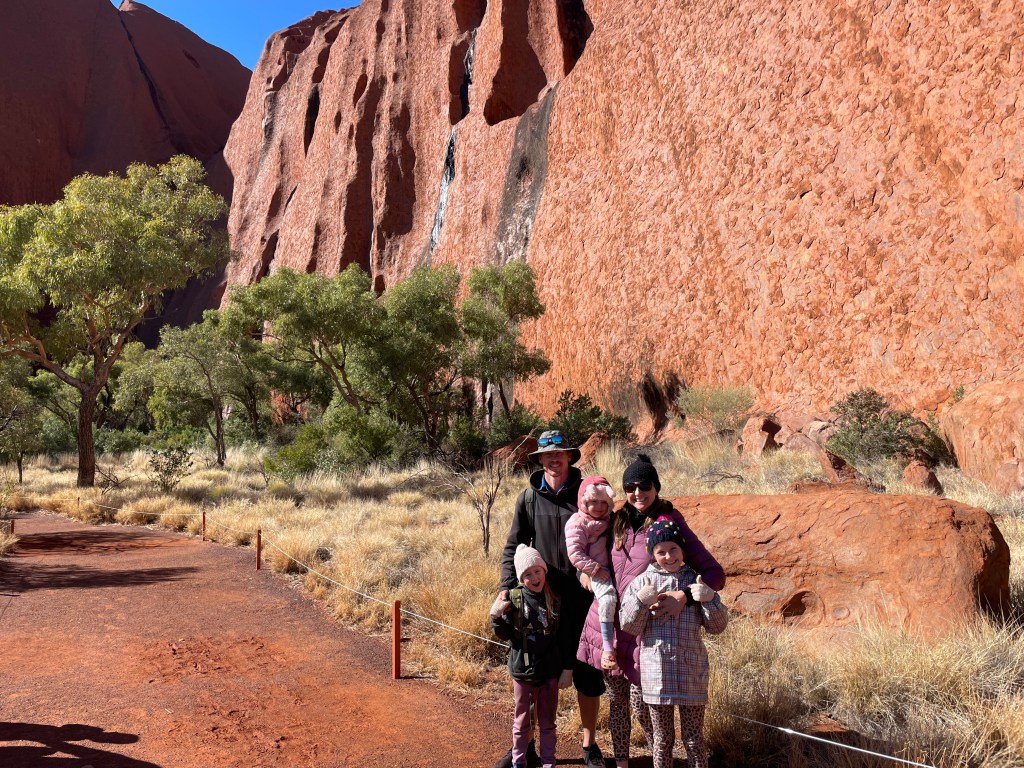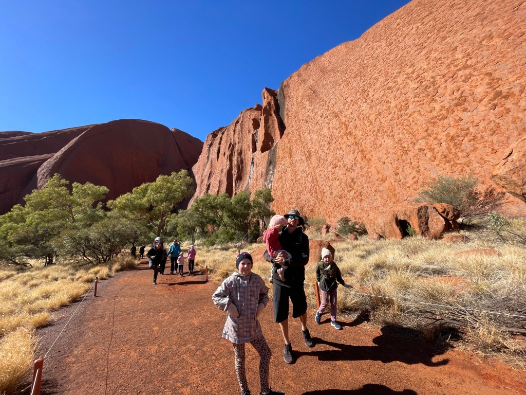 To soften the blow we stopped off for a coffee fuel up and babycinos for the girls to get them through the day. By the time we arrived, a free guided walk was starting and we tagged along to listen to James, a local Aboriginal guide and young Emerson who is training to be a guide and ranger, tell stories of his experiences and knowledge around Uluru.