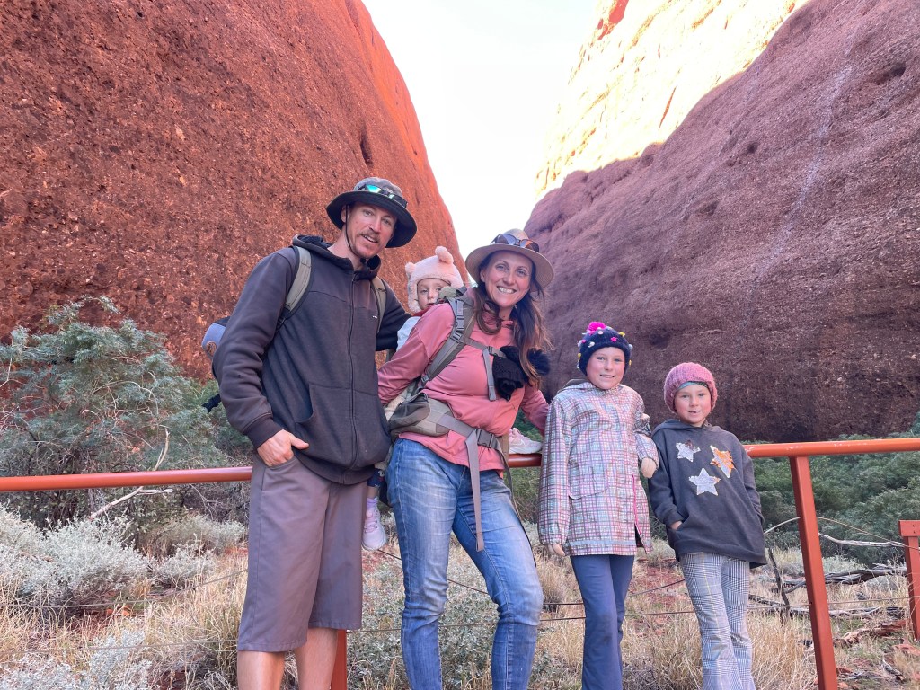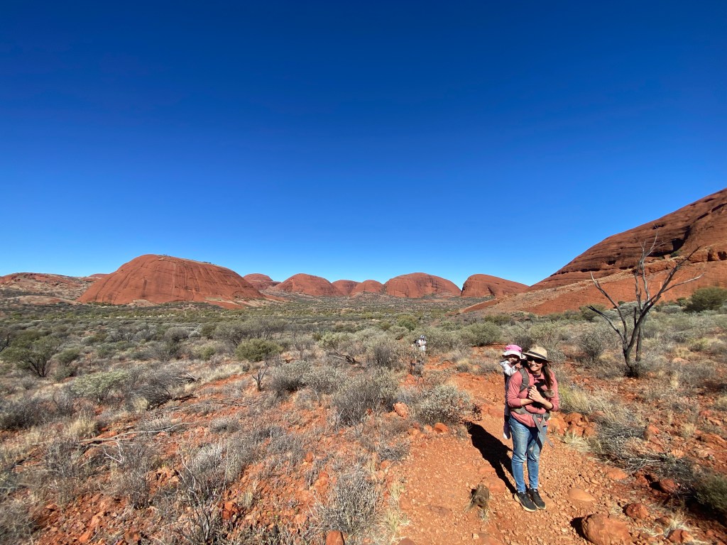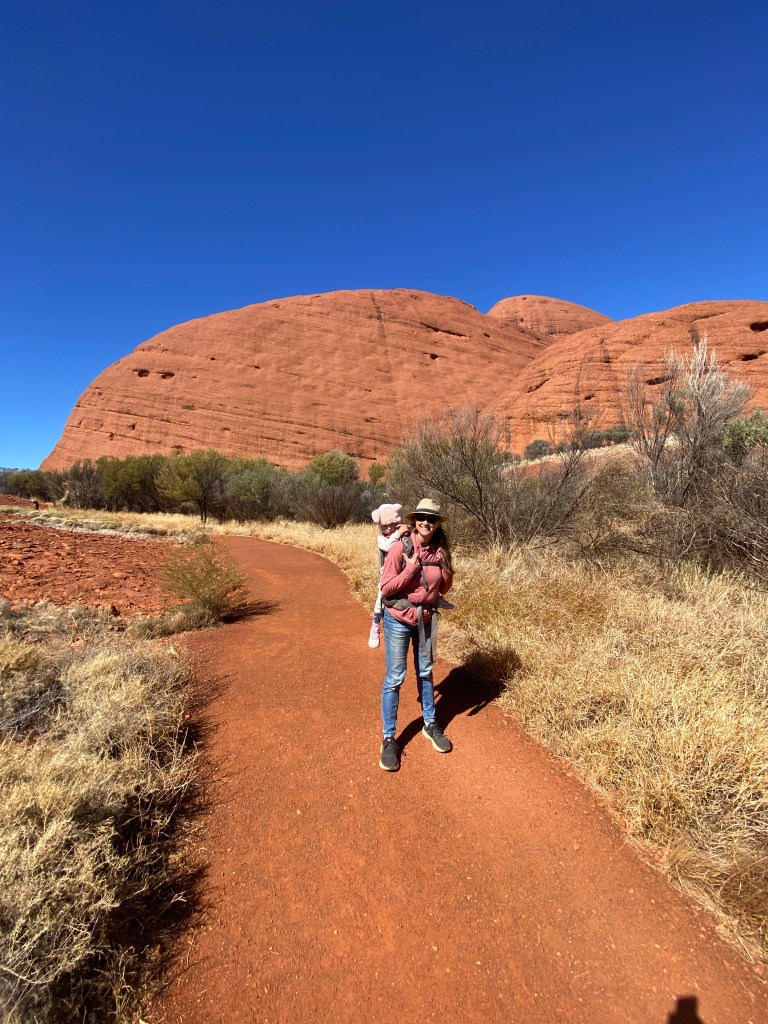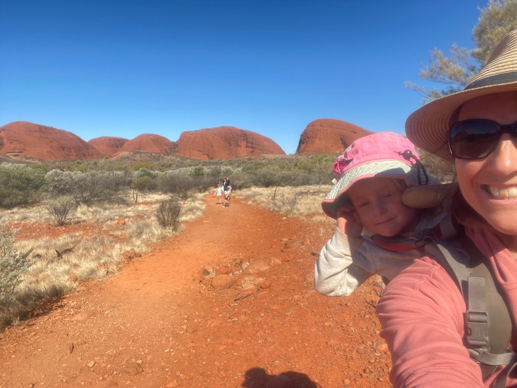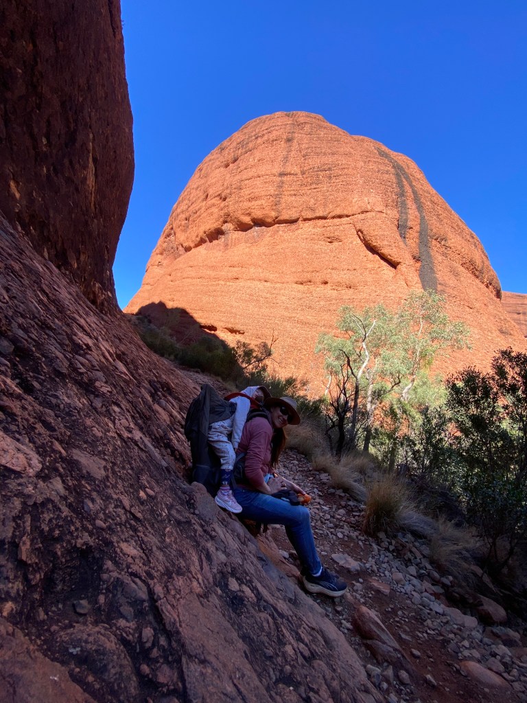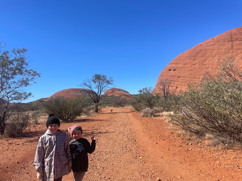 By the time we actually got to the National Park it was almost lunchtime, so we decided to check out the Gorge at Kata Tjuṯa. It was beautiful but so very windy and everyone was glad to have their beanies and warm layers on. Scarlett also loved the echo and kept trying to test it over and over and over again.