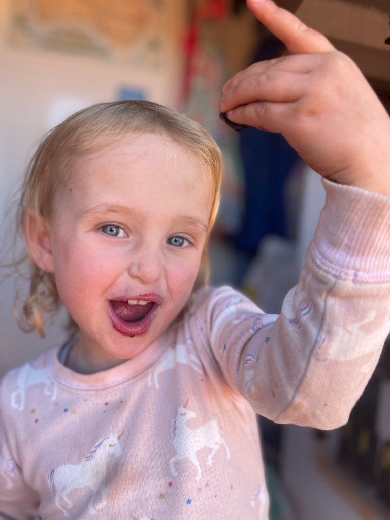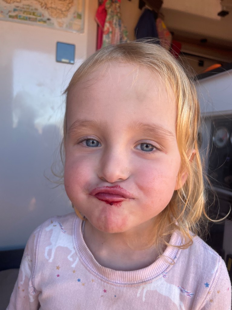 Just before the WA border we stopped for lunch to eat any leftover fruit & veg so that it wouldn’t end up in the quarantine bin. Scarly had a great old time with the cherries and painting her lips again. She’s too funny!