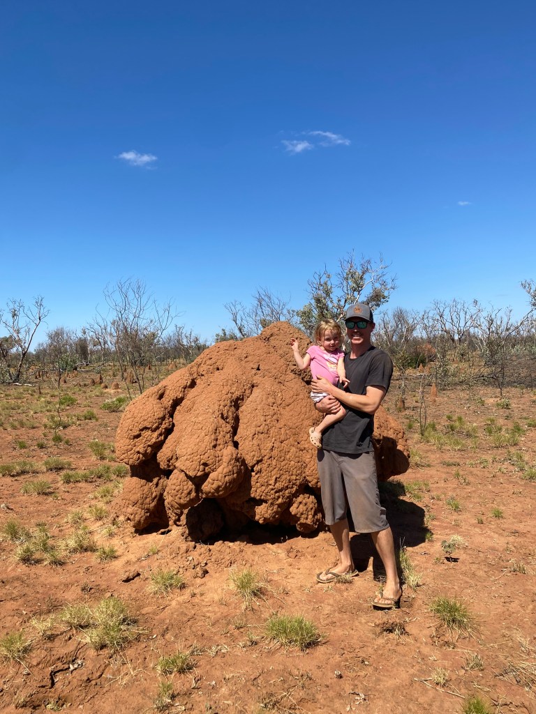 The drive out seemed much faster and more pleasant this time and before we knew it we were back on the highway. It actually was graded too, a lovely surprise! The termite mounds in the area were giant and we told the girls there were dinosaur poo, which Scarly loved 😂